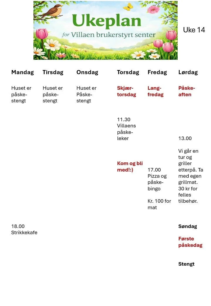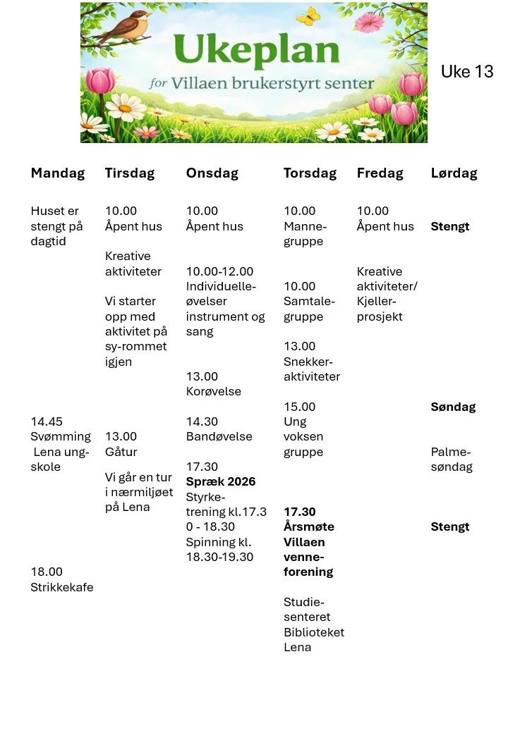 Her finner du oversikt over hva som skjer på og utenfor huset i regi av Villaen brukerstyrte senter.